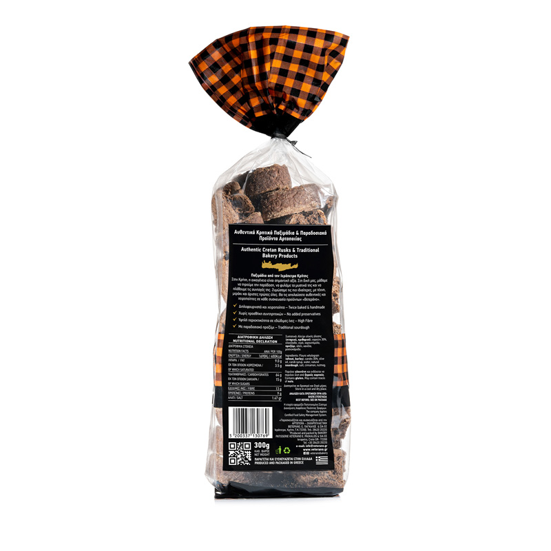 Συστατικά: Άλευρα ολικής άλεσης (σιταριού, κριθαριού), χαρούπι, ελαιόλαδο, χαρουπόμελο, νερό, φυσικό προζύμι, αλάτι, κανέλα, μοσχοκάρυδο.